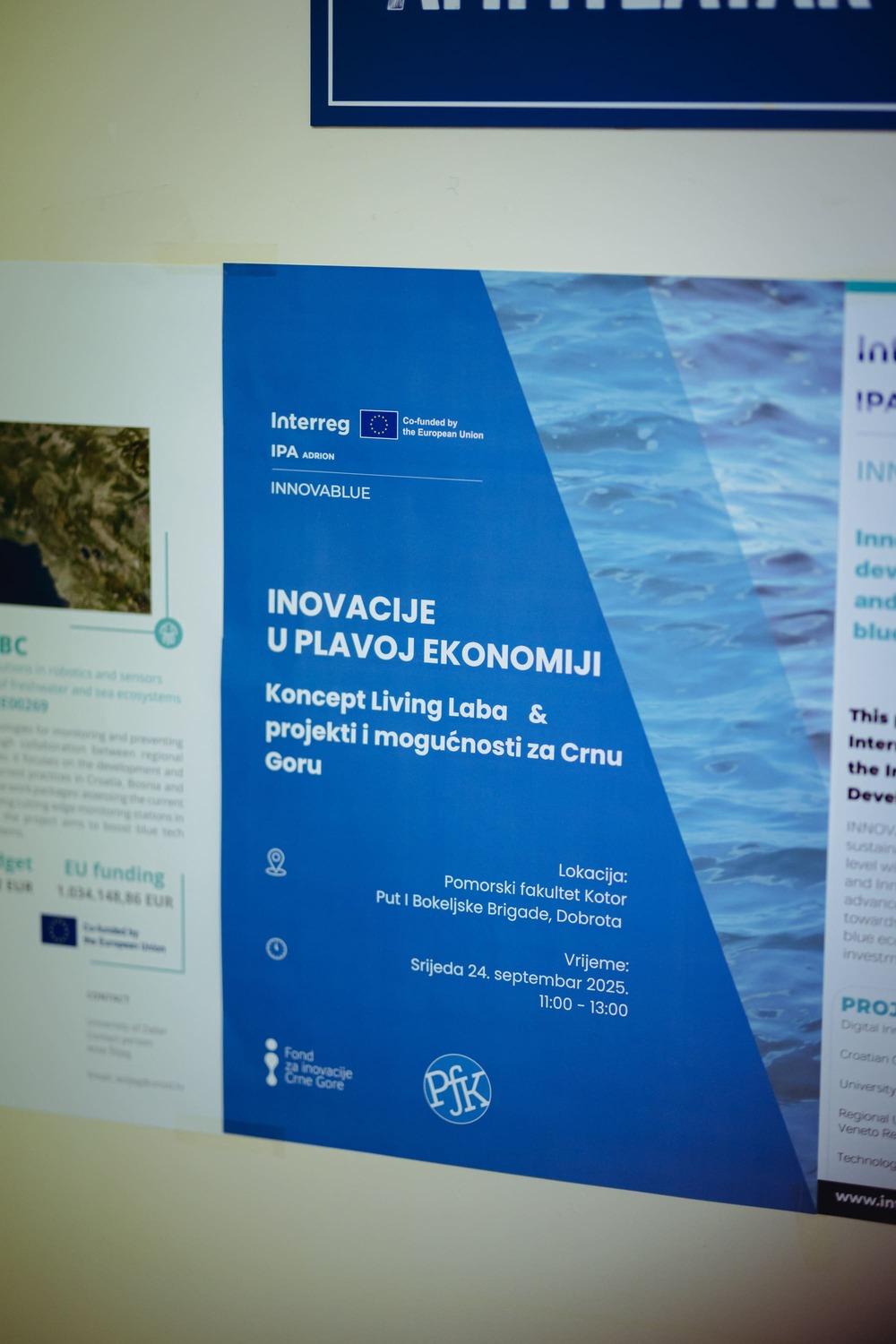 Innovation Fund of Montenegro, in cooperation with the Faculty of Maritime Studies, Kotor, University of Montenegro, organized the seminar “Innovations in the Blue Economy – Living Lab Concept, Projects and Opportunities for Montenegro” on 24 September 2025 at 11:00 a.m. at the Faculty of Maritime Studies (Kotor, Put I Bokeljske brigade 44). The seminar was organized within the project “Innovation Network for the Development of Solutions and Technologies for a Sustainable Blue Economy in the ADRION Region – INNOVABLUE,” financed under the IPA ADRION Programme (2021–2027) with the aim of fostering a sustainable blue economy in the Adriatic-Ionian region.