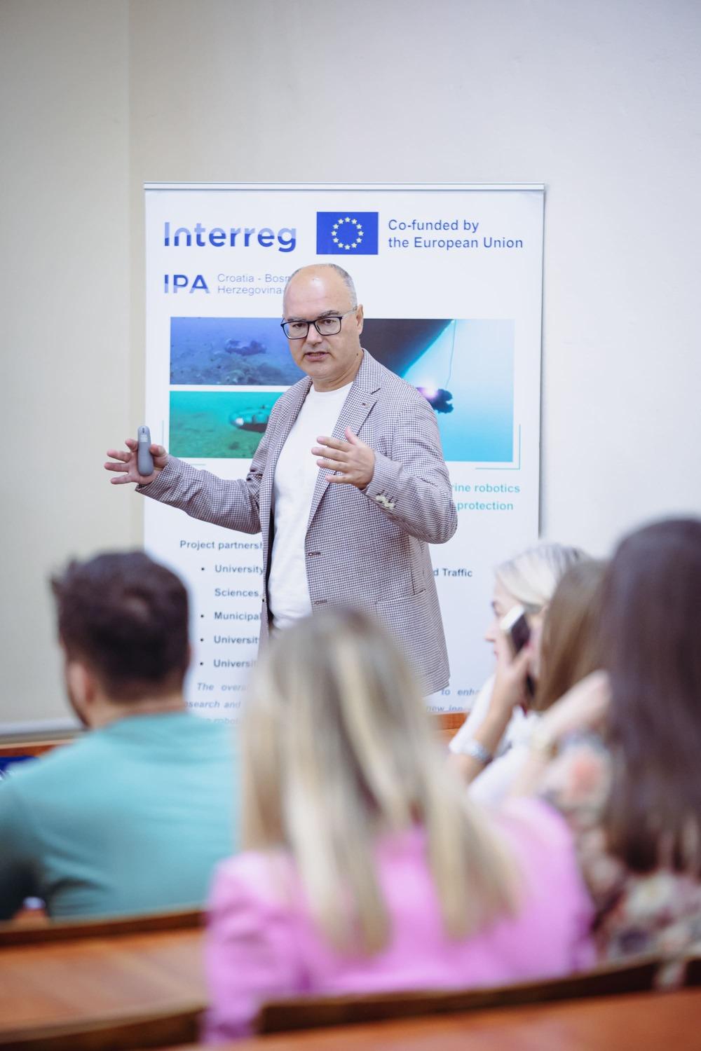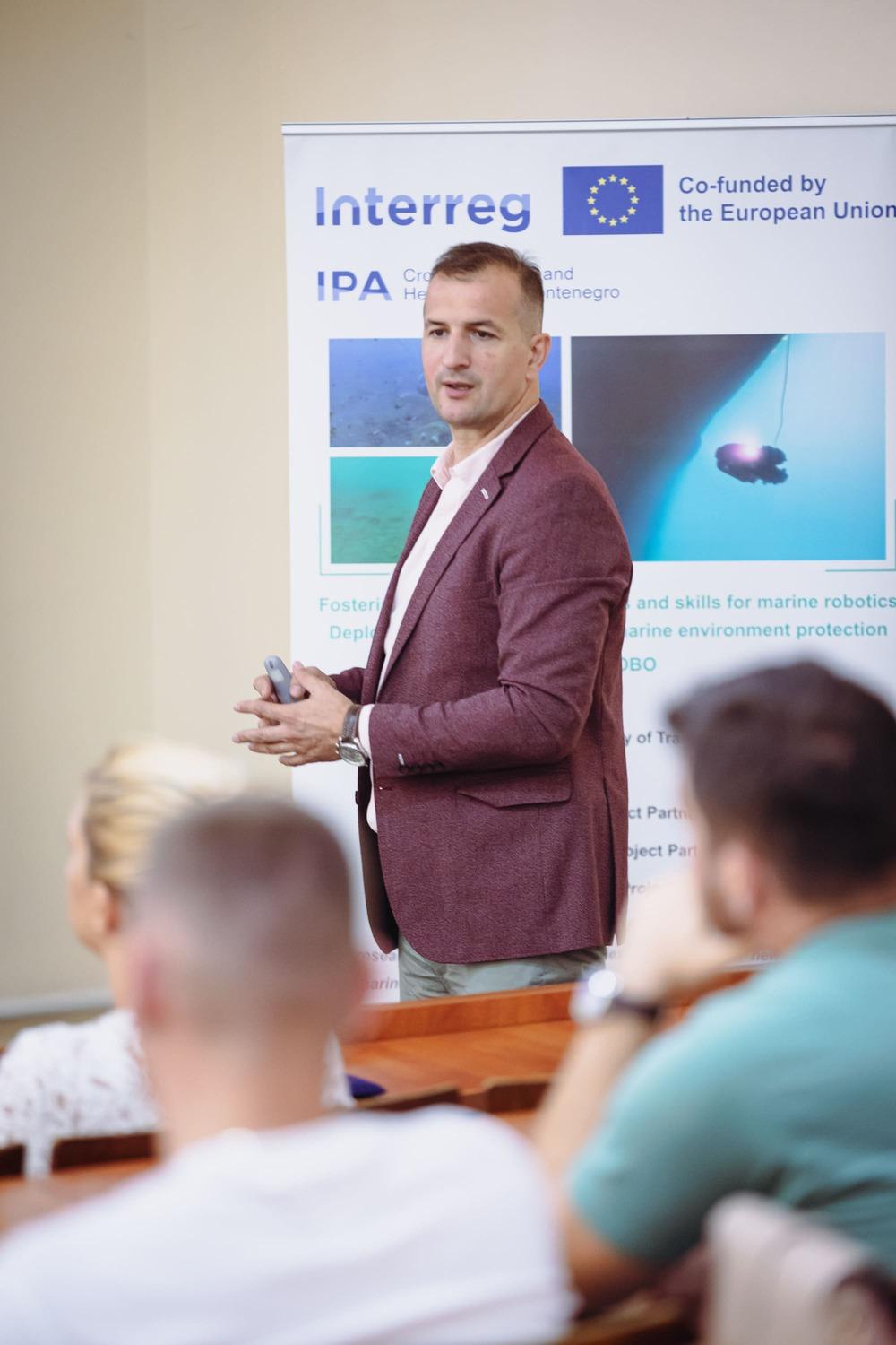 After presentations from the Faculty of Maritime Studies, participants heard from Mateo Ivanec, Executive Director of the Digital Innovation Hub Innovamare – DIH Innovamare (Croatia), the lead partner of the INNOVABLUE project. He outlined the objectives and benefits of DIH Innovamare for network members, the online MAIROS platform for collaboration between academia, business and investors in the blue economy, and shared experiences from the Living Lab in Šibenik as an example of infrastructure for testing innovative marine technologies in a real-world environment.