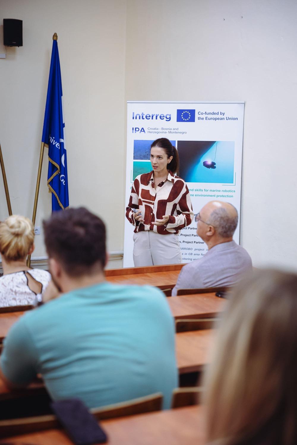 The program continued with a presentation by prof. dr Snežana Šćepanović, Head of the Department for EU Project Management and Support at the Innovation Fund of Montenegro. Prof. Šćepanović presented the concept of the blue economy and the role of Living Labs, the results achieved so far within the INNOVABLUE and ROBONET projects, and highlighted the advantages of establishing a Living Lab for testing innovative marine technologies in Montenegro. She emphasized that three locations have already been defined within the INNOVABLUE project for setting up new Living Labs in the ADRION region: the Faculty of Maritime StudiesbKotor, University of Montenegro – Boka Kotorska Bay (Montenegro); Vransko Lake (Croatia); and the YouSea Institute, Portorož (Slovenia).