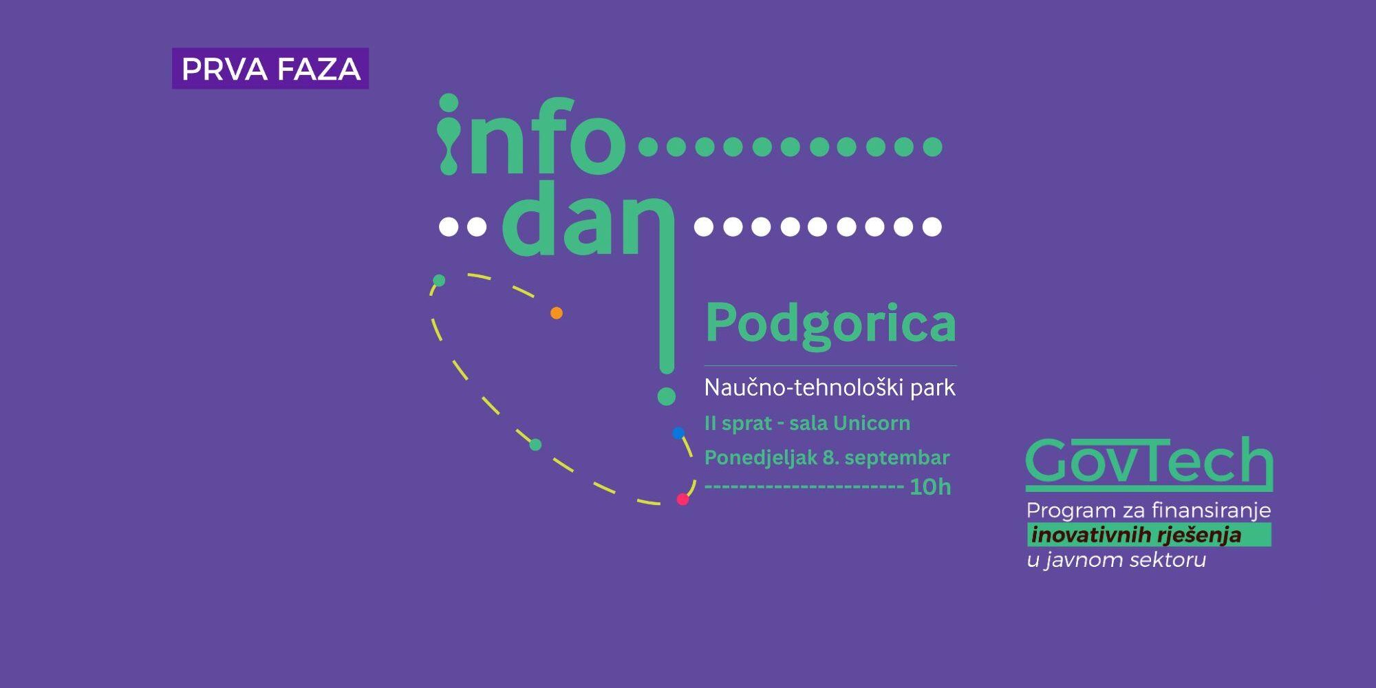 U okviru Javnog poziva za prvu fazu realizacije programa za finansiranje inovativnih rješenja u javnom sektoru – GovTech Fond za inovacije Crne Gore organizuje Info dan u ponedjeljak, 8. septembra, sa početkom u 10:00 časova, u zgradi Naučno-tehnološkog parka (sala UNICORN, drugi sprat).